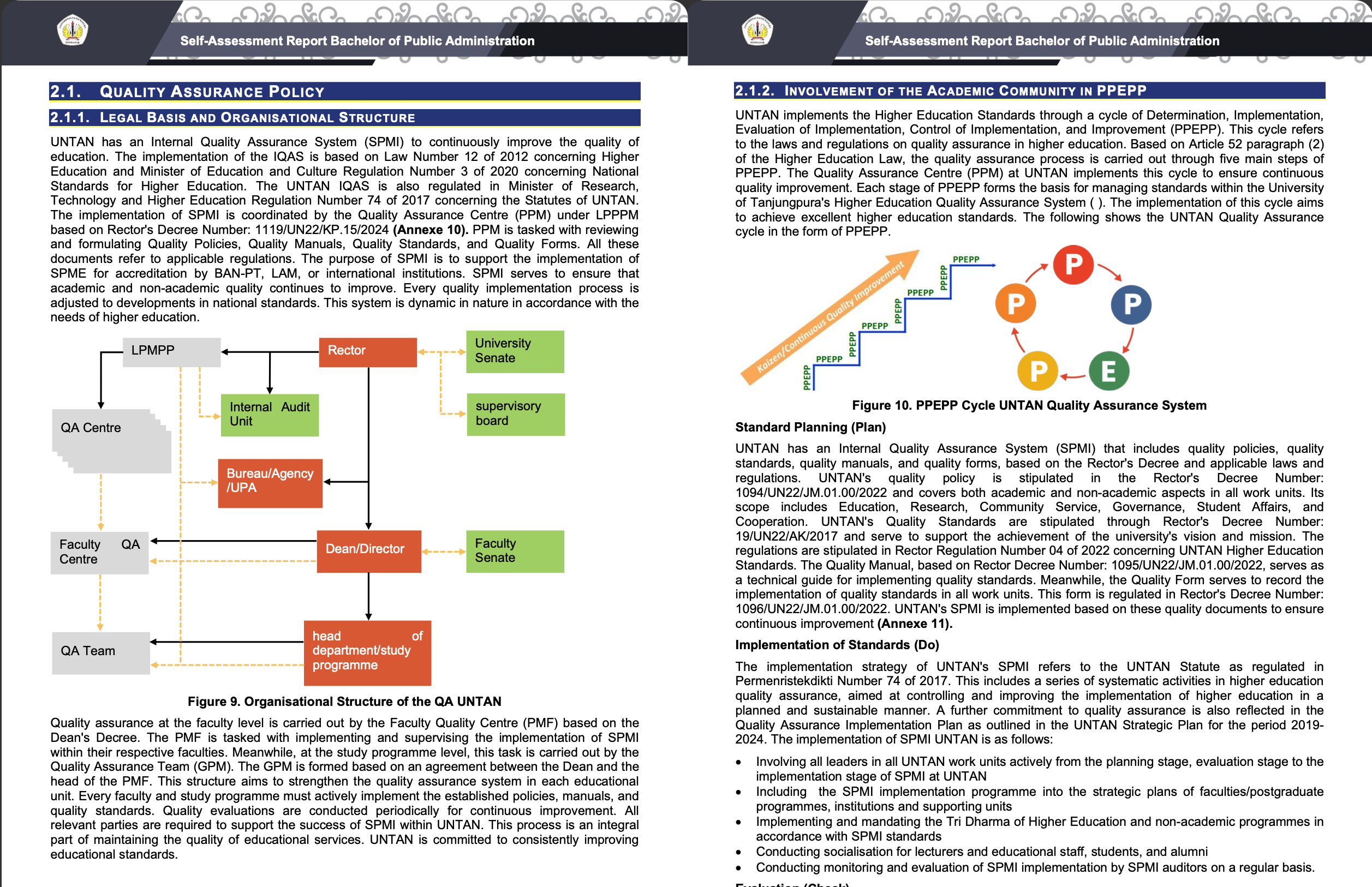 Universitas Tanjungpura (UNTAN) memiliki Sistem Penjaminan Mutu Internal (SPMI) yang terstruktur untuk terus meningkatkan mutu pendidikan secara berkelanjutan. Pelaksanaan SPMI didasarkan pada peraturan perundang-undangan yang berlaku, dikoordinasikan oleh Pusat Penjaminan Mutu (PPM) di bawah LPPPM, yang bertugas merumuskan Kebijakan Mutu, Manual Mutu, Standar Mutu, dan Formulir Mutu.